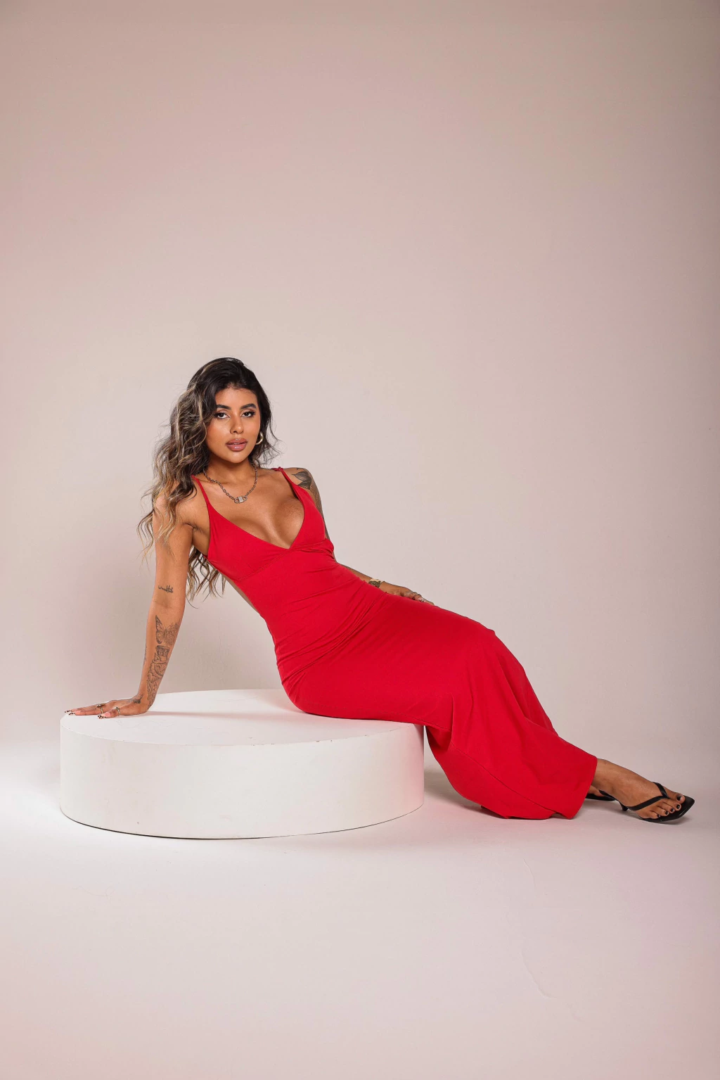 Vestido confeccionado no tecido poliamida de alta qualidade.